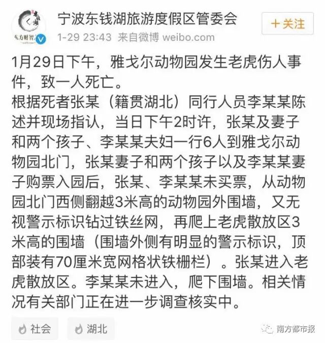下面是事情的经过:据宁波东钱湖旅游度假区管委会昨日晚间发布的信息显示:1月29日下午,雅戈尔动物园发生老虎伤人事件,致一人死亡。根据死者张某(籍贯湖北)同行人员李某某陈述并现场指认,当日下午2时许,张某及妻子和两个孩子、李某某夫妇一行6人到雅戈尔动物园北门,张某妻子和两个孩子以及李某某妻子购票入园后,张某、李某某未买票,从动物园北门西侧翻越3米高的动物园外围墙,又无视警示标识钻过铁丝网,再爬上老虎散放区3米高的围墙(围墙外侧有明显的警示标识,顶部装有70厘米宽网格状铁栅栏)。张某进入老虎散放区。李某某未进入,爬下围墙。相关情况有关部门正在进一步调查核实中。