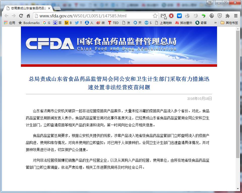 也就是说,现在的情况是,直到2016年3月18日,山东省食品药品监管局还没有查清疫苗等相关产品的来源和流向,也没有报备到国家食药局总局。