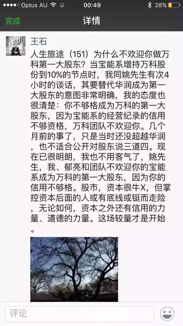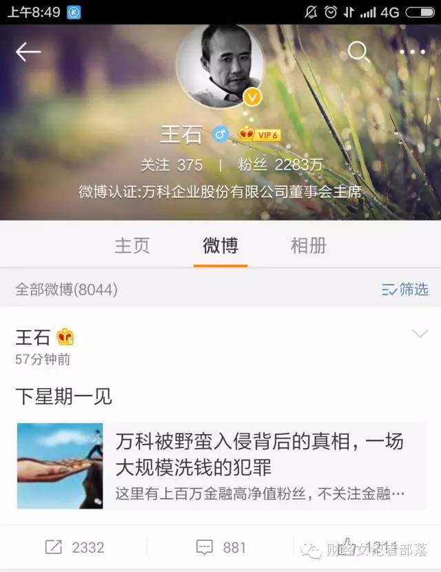 万科股权争夺战硝烟再起,宝能系和王石之争胜负未定,王石今早(19日早)转发“万科被野蛮入侵背后的真相,一场野蛮洗钱背后的真相”一文,并附评称:下星期一见!