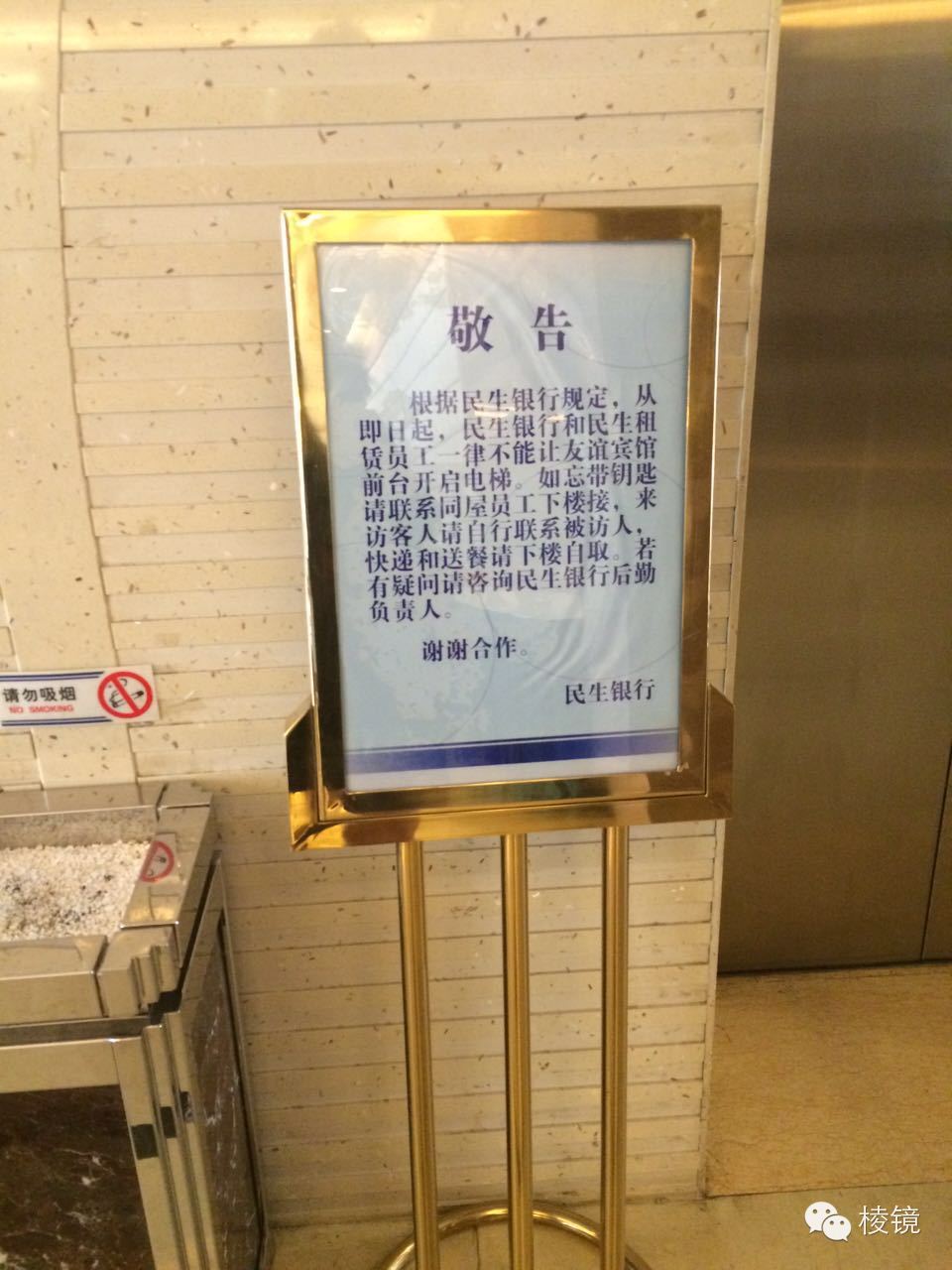 身陷舆论风暴的民生银行处处小心谨慎,已开始严查进入嘉宾楼的访客。在嘉宾楼电梯处,腾讯财经《棱镜》发现民生银行竖立的一个告示牌,要求从即日起,禁止员工让友谊宾馆前台帮忙开启电梯,如有访客、快递或外卖,当事人下楼接送及收取。
