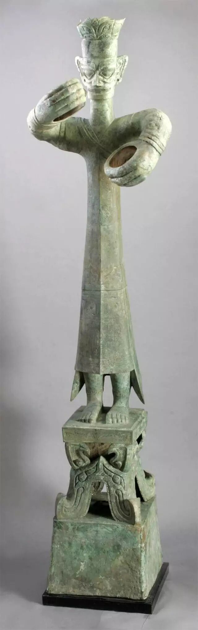三星堆遗址二号坑出土的发现的最大青铜器是环手铜人,全高262厘米,重180公斤,其面部特征与出土的其它铜人头是一样的。这个像身着左衽右襟长袍,头顶花形高冠,浓眉大眼,阔嘴方脸,大耳长颈,赤脚站在兽头型方座上,足上套着脚环。修长的身形,与身体各部比例严重失调。这个铜像最深秘的部分是左手上举拿着一个如饭钵的东西,右手下伸,也拿着一个如饭钵的东西。他的衣着及纹饰清晰、华丽,帽冠形制特殊、复杂、华美,发辫整齐、修长,在很多人眼里,他是一位有至高无上权利的人,他的身份一直没有定论。