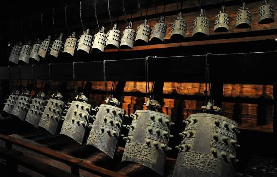 西周的编钟一般是由大小 3 枚组合起来的,春秋末期到战国时期的编钟数目就逐渐增多了,有 9 枚一组的和 13 枚一组的等等。1978年湖北随州南郊擂鼓墩的一座战国时代的曾侯乙墓出土的编钟,是至今为止所发现的成套编钟中最引人注目的一套。