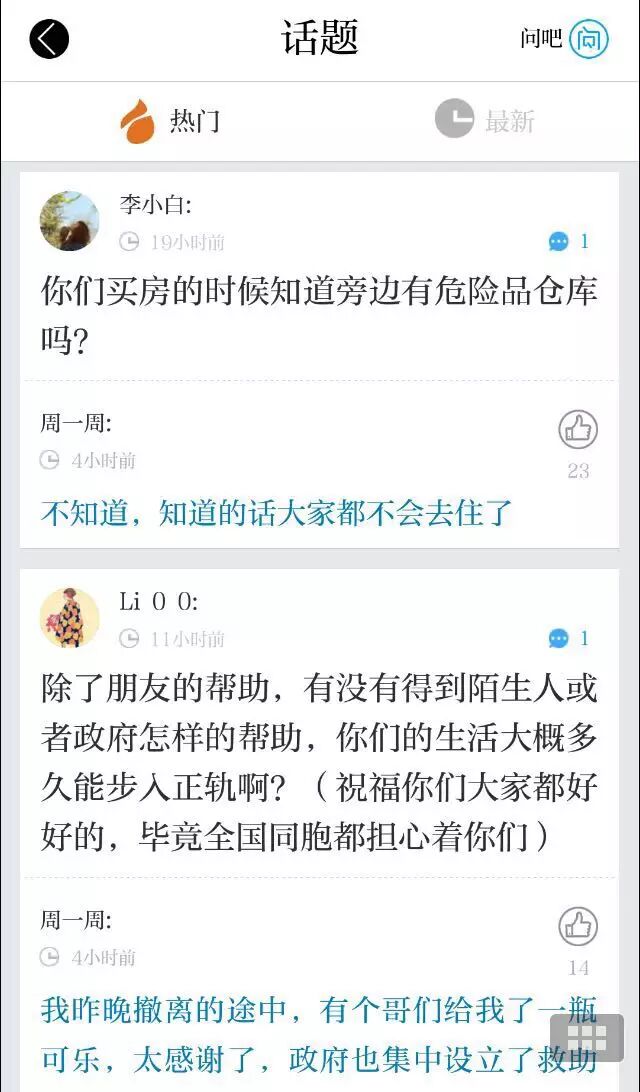 澎湃的互动栏目“问吧”在8月13日白天启动,既可以问爆炸前方报道小组,也可以问天津爆炸事故亲历者。截止新榜截稿时,前者有759个提问,51个回复,后者有166个提问,14个回复。