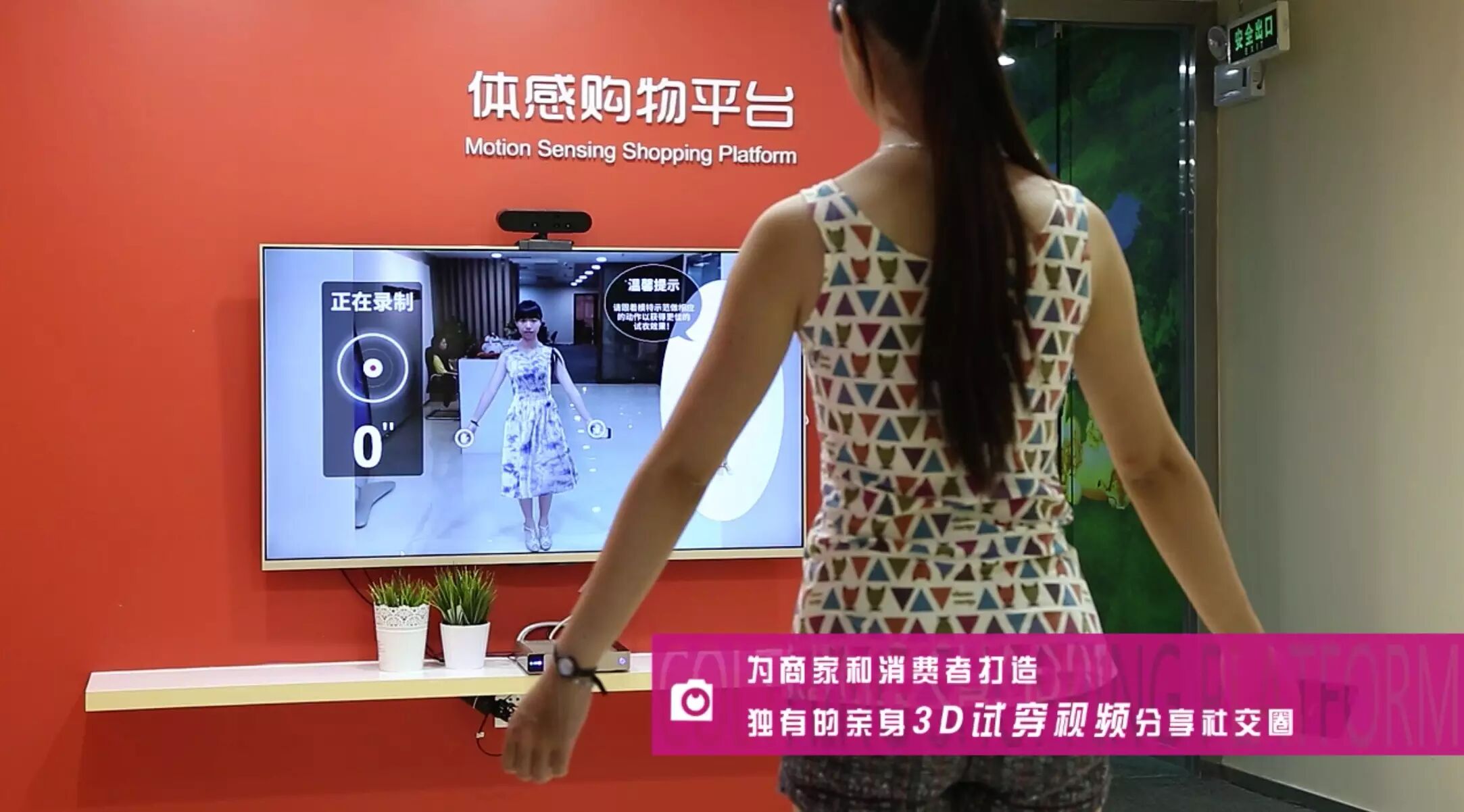 第三代产品,终于实现了商业化的突破。它的3D试衣效果,已经如同大家在片头看到的那样,而且可以通过3D试衣镜,实现现场效果的拍摄,扫二维码,再支付购买或者到社交媒体上分享。它已经成为了试穿,分享,支付和购物的自助购物终端,如果有足够多的终端,它就是一个线下体验良好的场所。