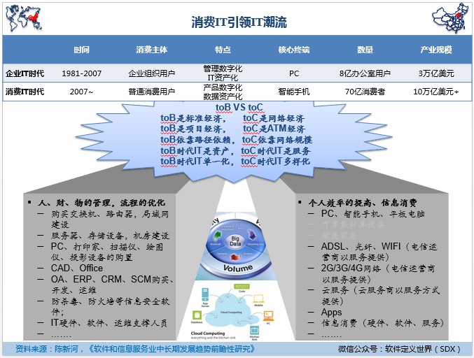 IT产业巨变的核心动力来自于用户群体的快速增加,也可以说是IT扩散的范围迅速变大,核心IT设备PC从每个办公室扩展到每个家庭。软件从驱动办公室自动办公设备,为数亿办公室白领用户服务、生产流程管理服务,扩展到软件驱动互联网为数十亿普通消费者的生活、娱乐、信息消费服务。