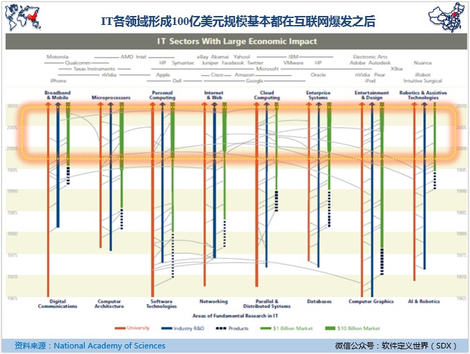 ◎ 过去十年, IT对经济社会的影响比之前的50年还要显著。2012年,美国国家科学院(United States National Academy of Sciences, NAS)对IT历史的研究表明,移动通信、微处理器、PC、互联网、企业IT系统和个人娱乐等多个领域尽管早在20世纪80年代前后便已形成产业化,但形成100亿美元规模产业却基本都是在1995年互联网爆发之后。微处理器在1980年开始批量进入市场,在1986年左右形成10亿美元产业,在1995年形成100亿美元规模产业;PC虽然在1983年便已形成10亿美元规模,但在1998才达到100亿美元;企业IT系统在1982年产业化,在1990年才形成10亿美元产业,1997年突破100亿美元;个人娱乐更是早在1970年便已产业化,在1977年就形成10亿美元产业,但在2004年才达到100亿美元。