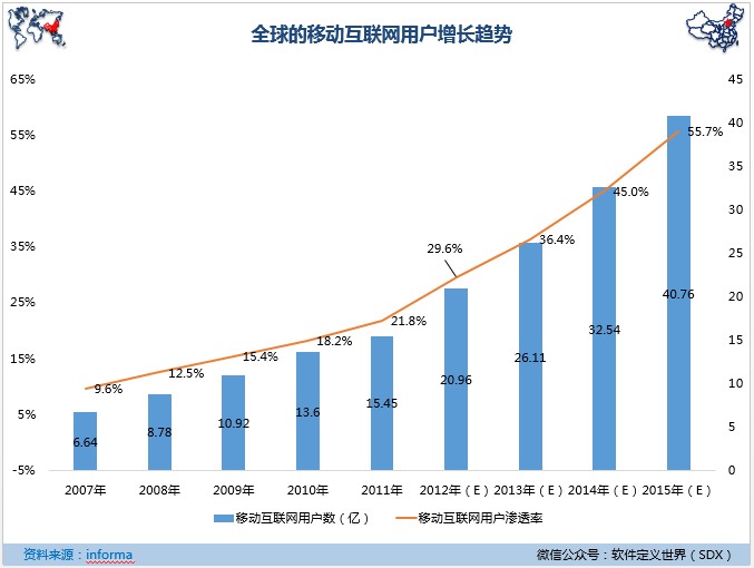 图2:2007年~2015年全球的移动互联网用户增长趋势