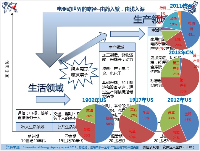 ◎电驱动世界的路径—由简入繁,由浅入深,先从照明等生活领域开始,逐步进入生产领域,从而带动工业生产率的大幅提高,之后在生活领域的进行深化应用,冰箱、电视、洗衣机等不断改善人类的生活条件。电的应用路径受人类认知过程、发明创新进程、基础设施建设进程、成本下降过程等多方因素影响影响。