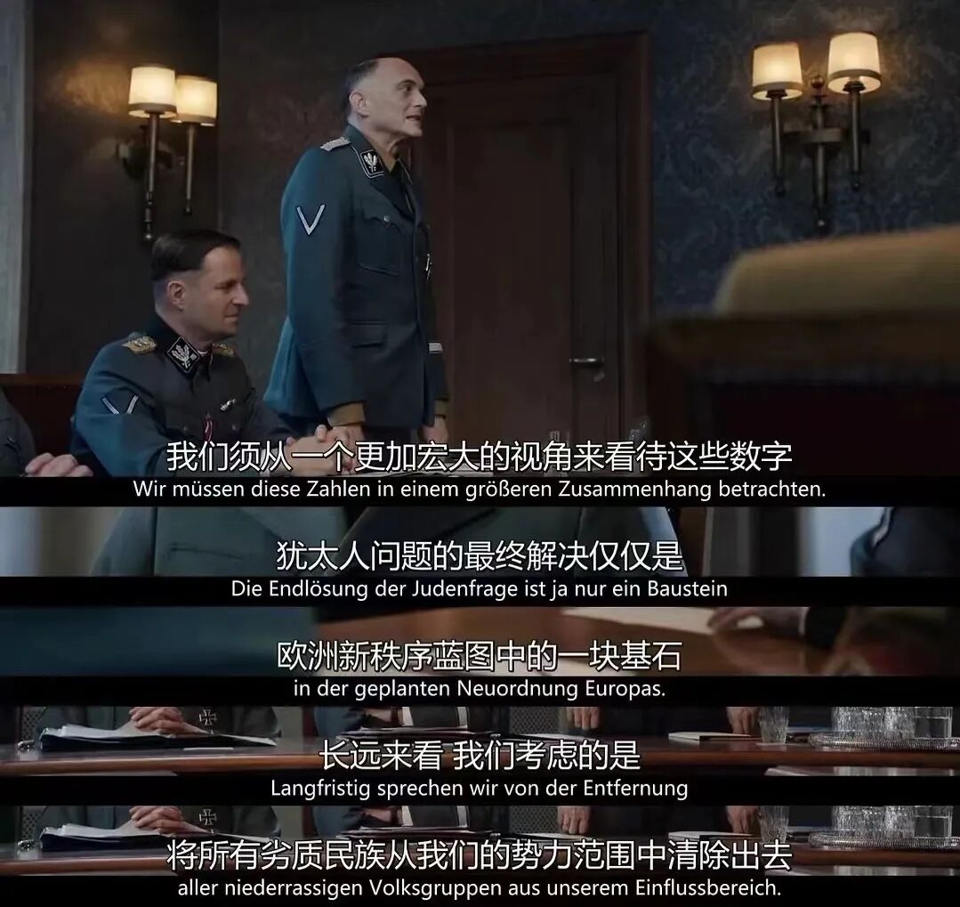 事实上,因为「平庸之恶」太过著名,甚至著名到遮蔽了阿伦特自己的关键论述。阿伦特当年认为,罪恶分为两种,一种是极权主义统治者本身的「极端之恶」,第二种是被统治者或参与者的「平庸之恶」。显然,无论对于圈定艾希曼这一纳粹特定符号,还是万湖会议中其余14位纳粹高官,更适用于他们的「极端之恶」,是当历史给予少数人决定众多人命运的机会,居于决定和设计位置的所谓纳粹精英们,如何利用极致的黑暗理性放任内心的恶毒,以至在人类历史上留下最阴暗冷酷的一页。对纳粹历史的描绘,《万湖会议》显然选择了极端之恶的立场——并不是一群被动参与者「无思想、无意志」地执行命令,而是一群手握第三帝国核心权力的人,在极端思想和狂热意志的支配下,各自「累积式激进」,最终在一场70分钟的会议上接力制造了人类历史上最高效冷酷的杀人流水线。电影中,希特勒一直作为绝对权力的幽灵出场,午餐会的时候,高官们三三两两讨论最终解决方案,一段对话是:海德里希在会上也有类似的表达,「命运偏偏选中了我们这一代来完成这个任务,而我们不能仅仅因为反感它,就拒绝执行。我们都是德意志民族的医生,没有一个医生会乐于为病人截肢。但是,如果我这是救命的唯一选择呢?」设置对立,简化思想,自我感动,就是在这样的运行模式之下,纳粹官僚机器冷酷碾过了数百万人的命运。遗憾的是,纳粹的产生并不来自于历史的偶然,而是出自历史的循环。从这种意义上说,《万湖会议》作为一部电影试图努力的方向是,还原历史局部的关键细节,引导人们明白罪恶的产生。在如今如此急躁分裂的世界,这类记录存在的意义,在于它永远可以作为一种警醒存在,人类曾踏入过那样的深渊,而那样的深渊,从来未曾真正彻底消失。![]()