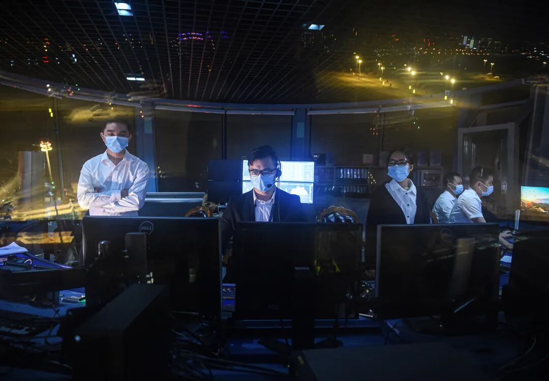 ▲在三亚空管站塔台管制室内,塔台管制员正在管制指挥 图/新华社