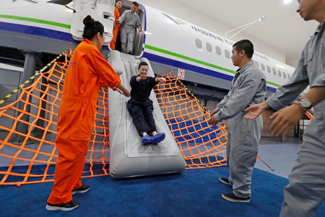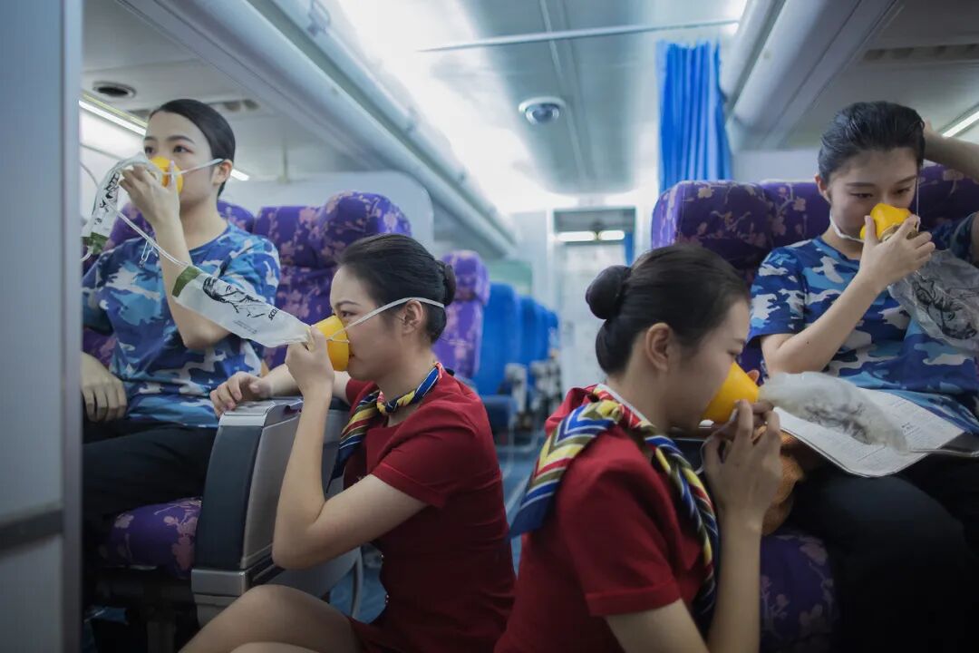 乘务员入行时要参加初始培训,合格后每年还要参加一到两次复训。“复训里一类训偏理论考核。二类训更考验人,有大量关于应急处理的内容。比如水上撤离和陆地撤离,遇到客舱失压、飞机破损、失火(包括烤箱、行李架、座椅、洗手间失火等等)应该怎么处置。特情考核还会叠加,中断起飞或者冲出跑道、氧气面罩掉下来、乘客心脏病发等等,多个情况叠加到一起成为一套题。”乘务员陈荔说。