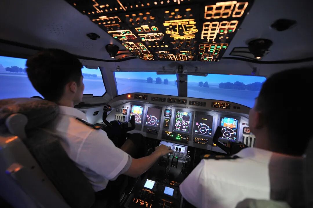 ▲四川广汉,中国民用航空飞行学院动态模拟机训练室,飞行学员在教员的指导下,使用模拟机进行矩形飞行训练 图/视觉中国