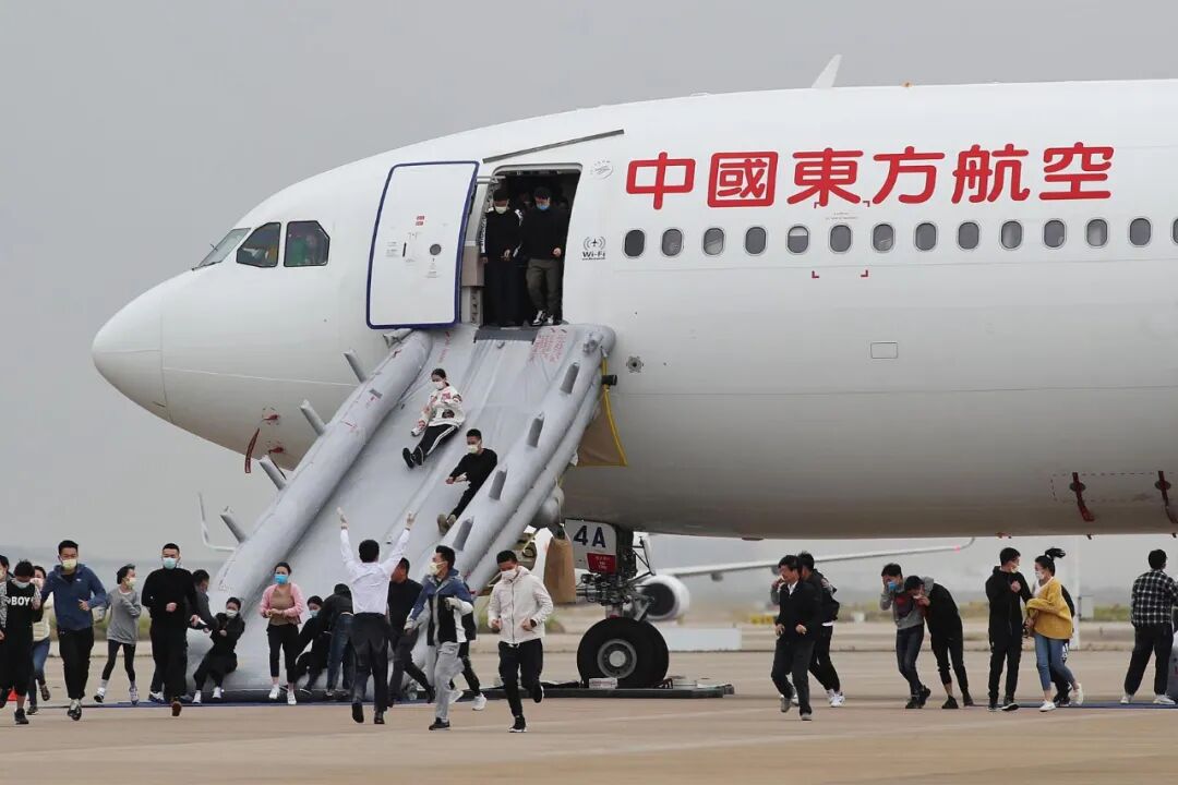 ▲上海,国航乘务员正在进行客机陆上撤离模拟训练 图/视觉中国