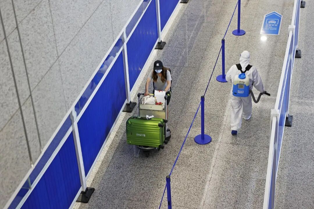 ▲2020年8月10日,上海浦东国际机场T2航站楼内,入境旅客行走在临时隔离专用通道内,工作人员对通道定时进行消毒工作 图/人民视觉