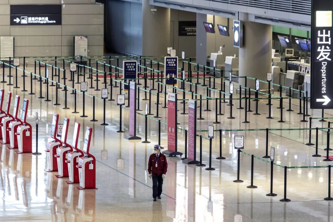 ▲2022年3月21日,中国上海虹桥国际机场,值机区几乎空无一人 图/人民视觉