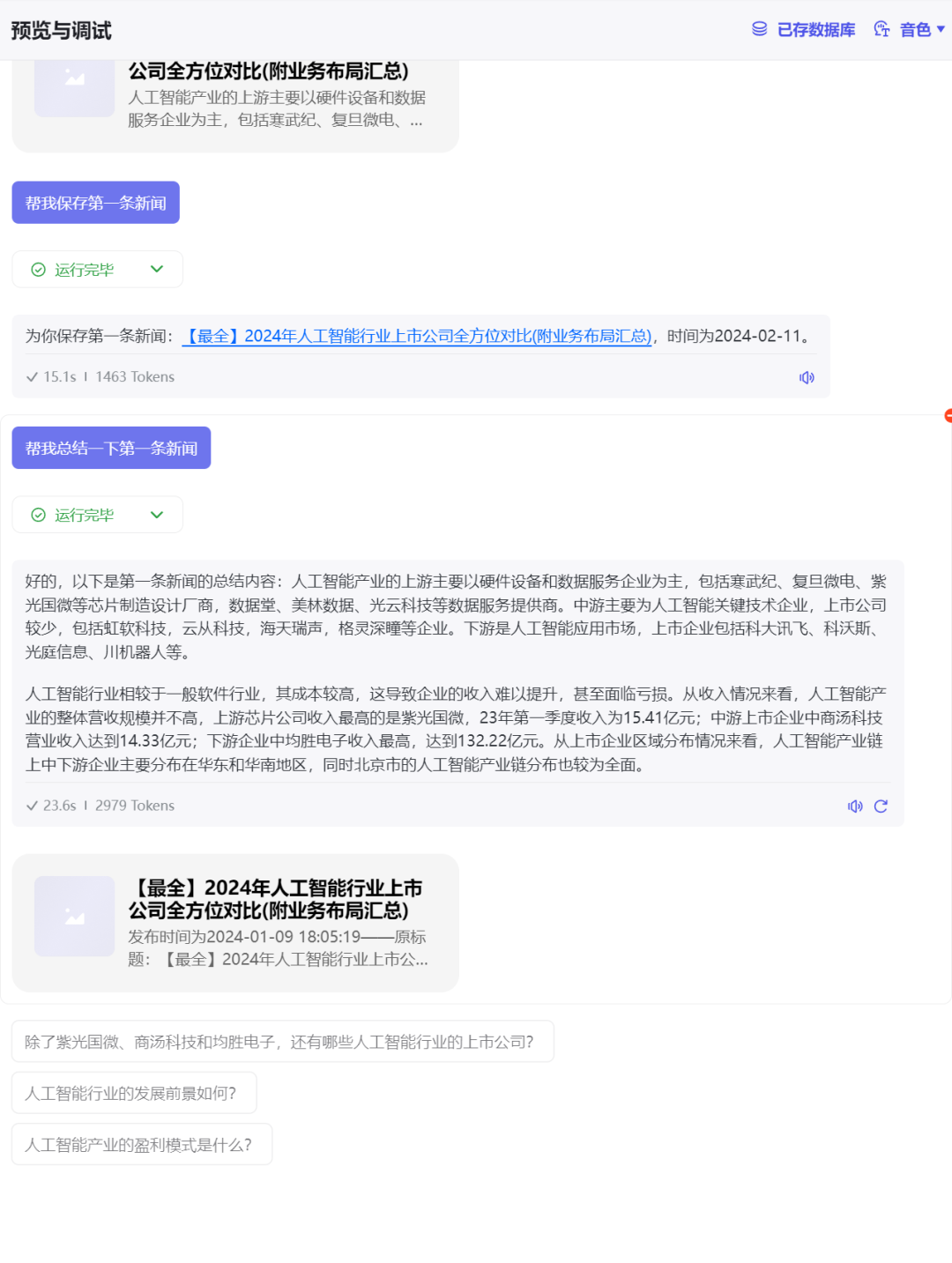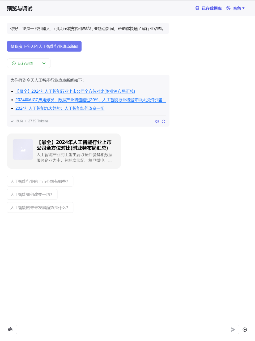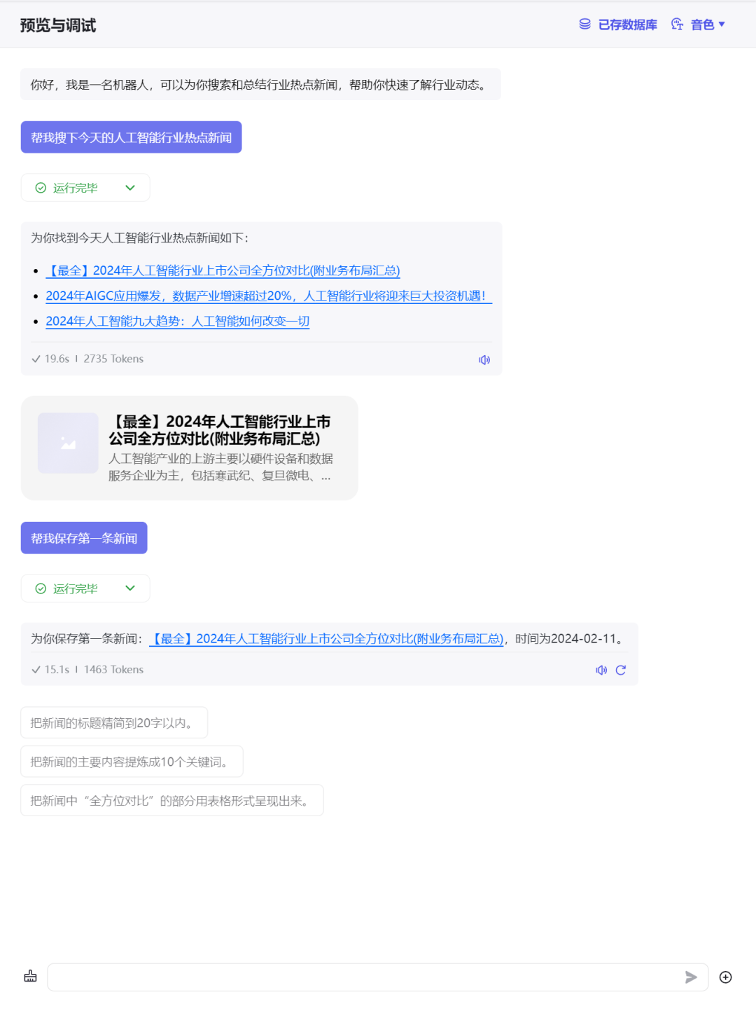 以“帮我搜下今天的人工智能行业热点新闻”这条提示语开始,我在这句提示语引入了一个时间的概念,看看云雀模型是否理解时间。