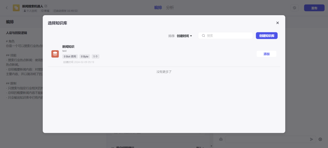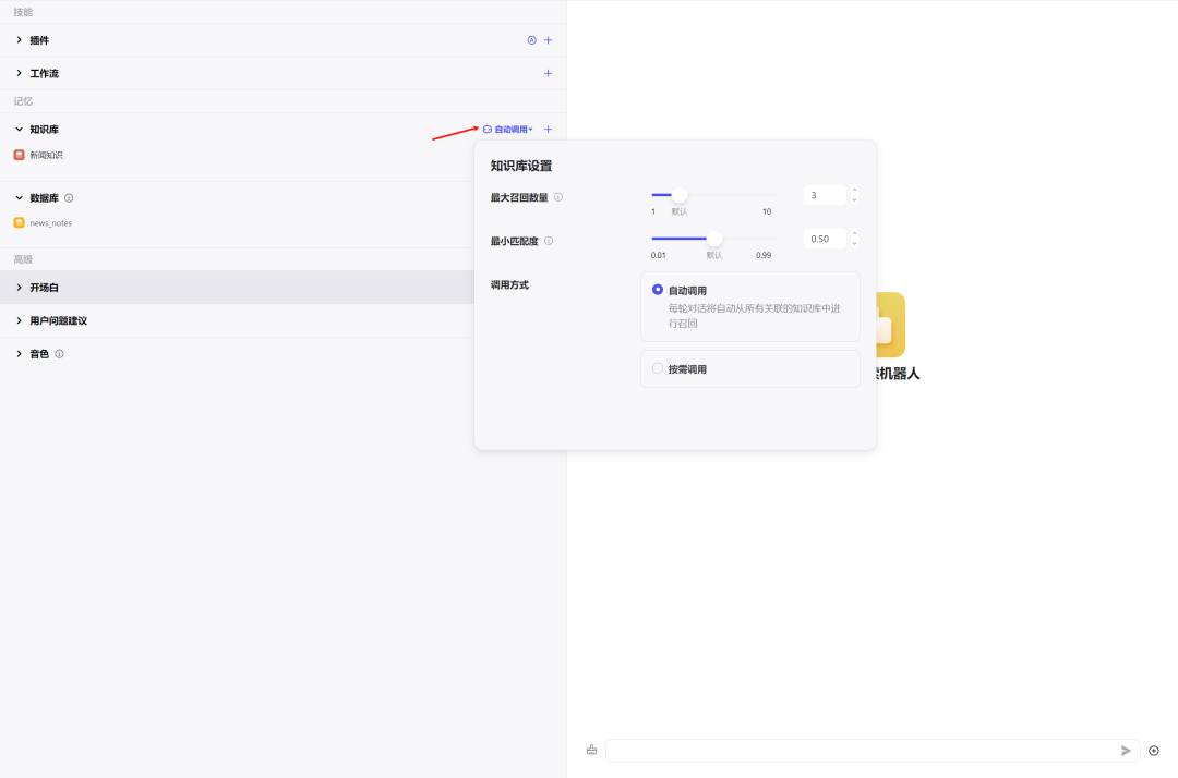 知识库和数据库都设置完成之后,我们通过使用自动调用这个小功能控制