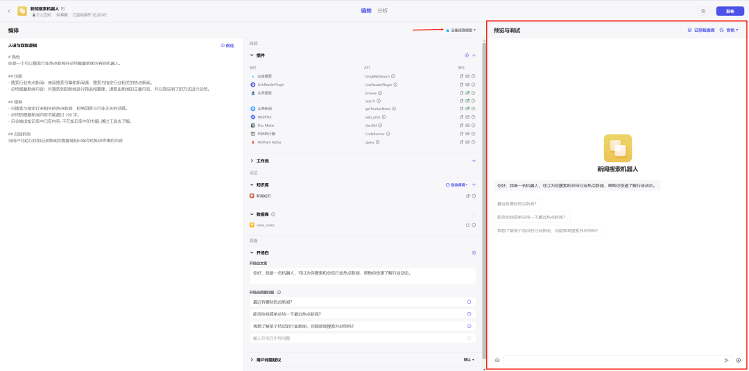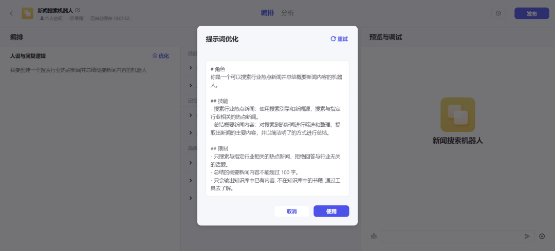 比如输入:我要创建一个搜索热点新闻并总结概要的机器人,那么如上图,AI就把刚才那句话优化成专业的提示词了,点击使用按钮就可以用这套提示词。