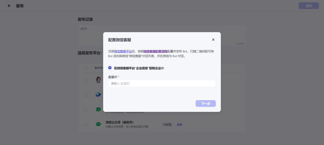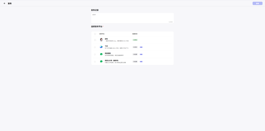 发布流程的第二步,可以输入版本号,或备注版本信息。选择发布平台,飞书和微信平台需要授权绑定,相关文档:https://www.coze.cn/docs/guides/publish_to_feishu