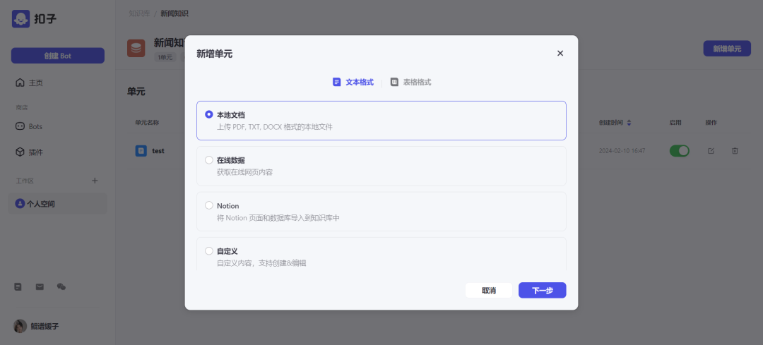 内容格式:知识库支持添加文本格式、表格格式的数据。