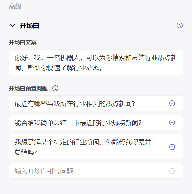 开场白文案可以通过AI生成,也可以手动输入,包括预置问题。