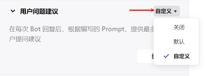 可以关闭建议;也可以在每次 Bot 回复后,自动根据对话内容提供 3 条用户提问的建议;自定义,可以通过提示词指令控制问题建议的精度,其实上白了就是控制对话上下文的连贯性,还是为了解决LLM的“幻觉”问题。