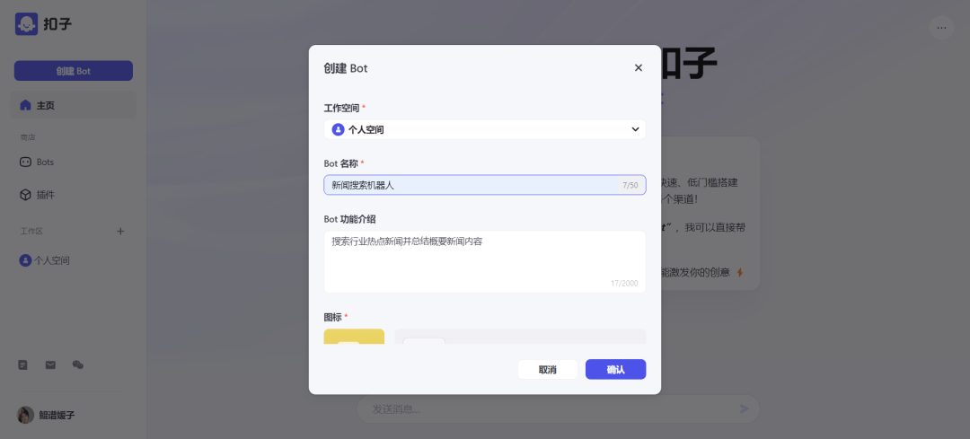 图标:可以上传自定义图标,还可以让AI根据Bot的名称和功能介绍自动生成图标。