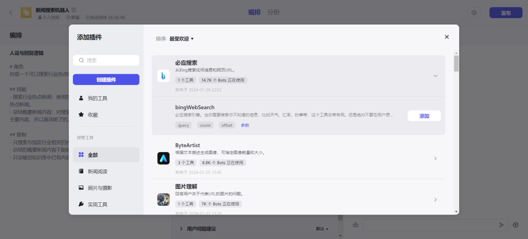 内置插件:目前平台已经集成了超过 60 款各类型的插件,包括资讯阅读、旅游出行、效率办公、图片理解等 API 及多模态模型。你可以直接将这些插件添加到 Bot 中,丰富 Bot 能力。例如使用新闻插件,打造一个可以播报最新时事新闻的 AI 新闻播音员。