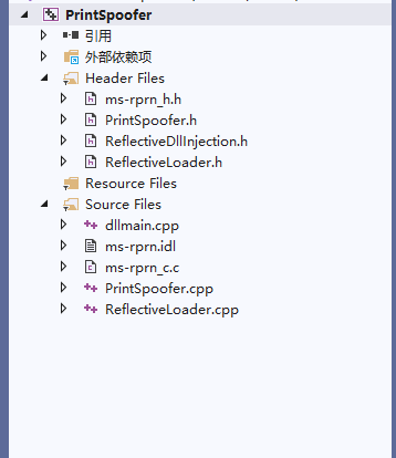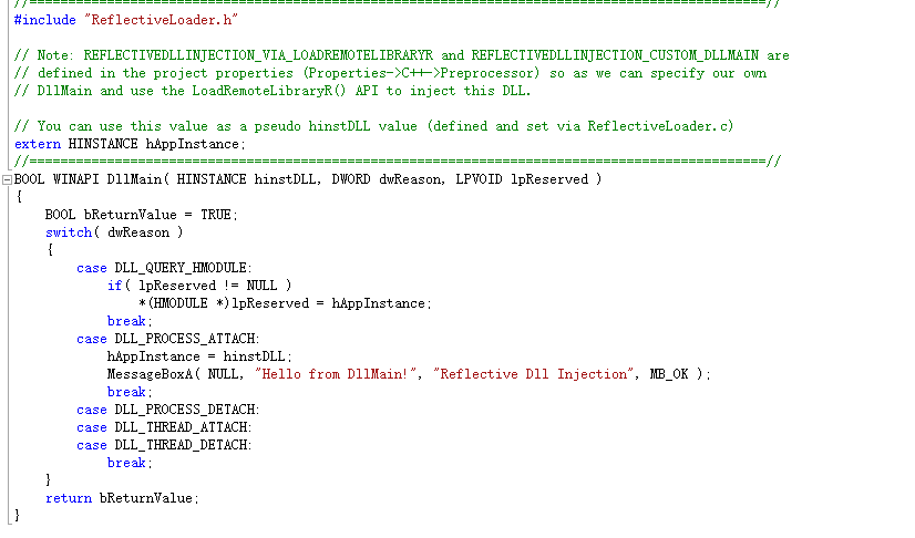 首先导入相关的头文件:ReflectiveDllInjection.h、ReflectiveLoader.cpp、ReflectiveLoader.h。