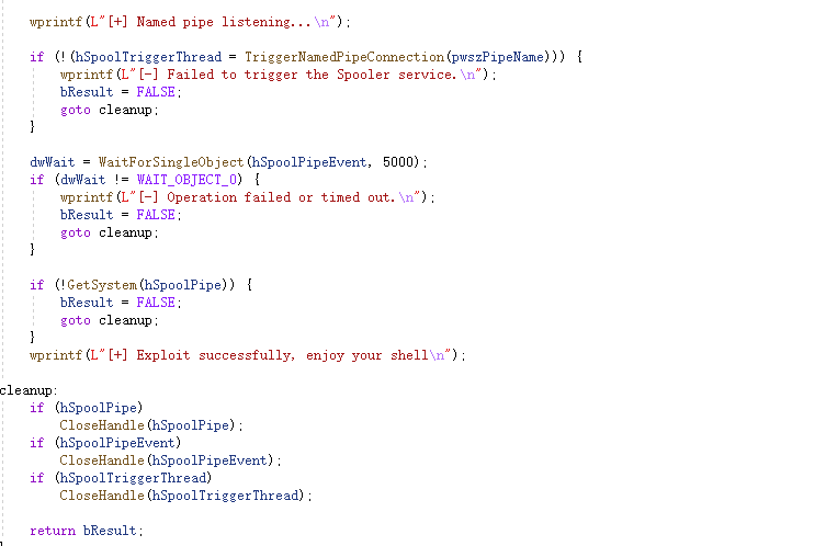BOOL GetSystem(HANDLE hPipe){if (!ImpersonateNamedPipeClient(hPipe)){wprintf(L"ImpersonateNamedPipeClient(). Error: %d\n", GetLastError());return FALSE;}wprintf(L"[+] ImpersoneteNamedPipeClient OK\n");return TRUE;}