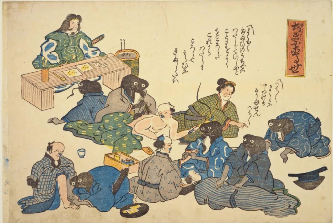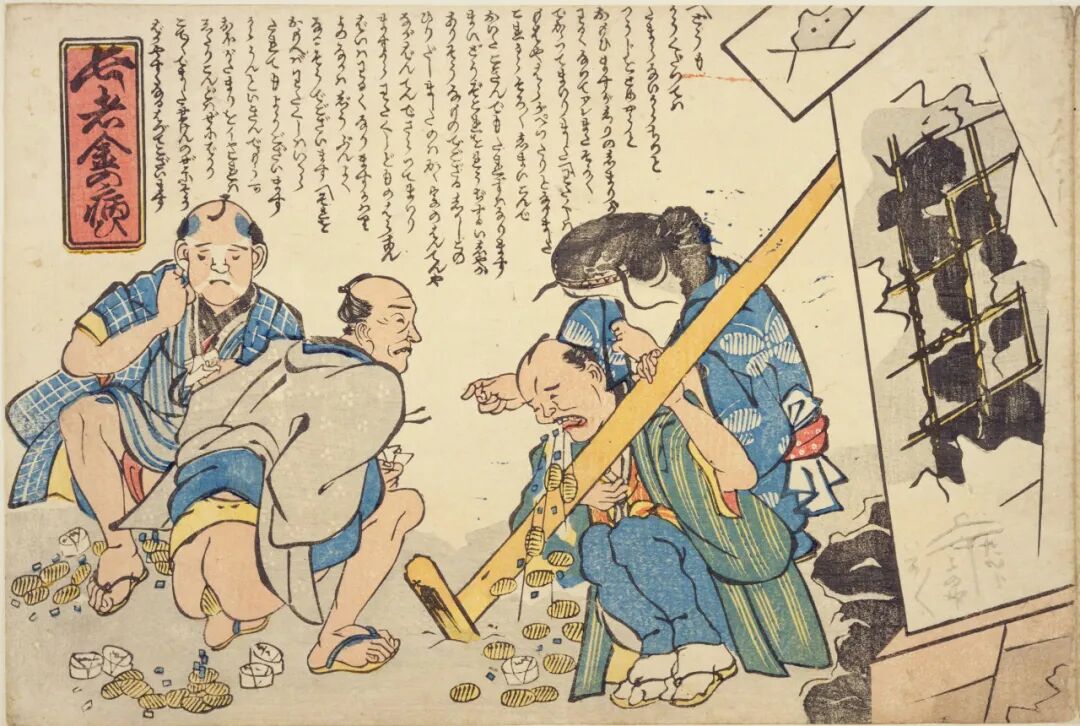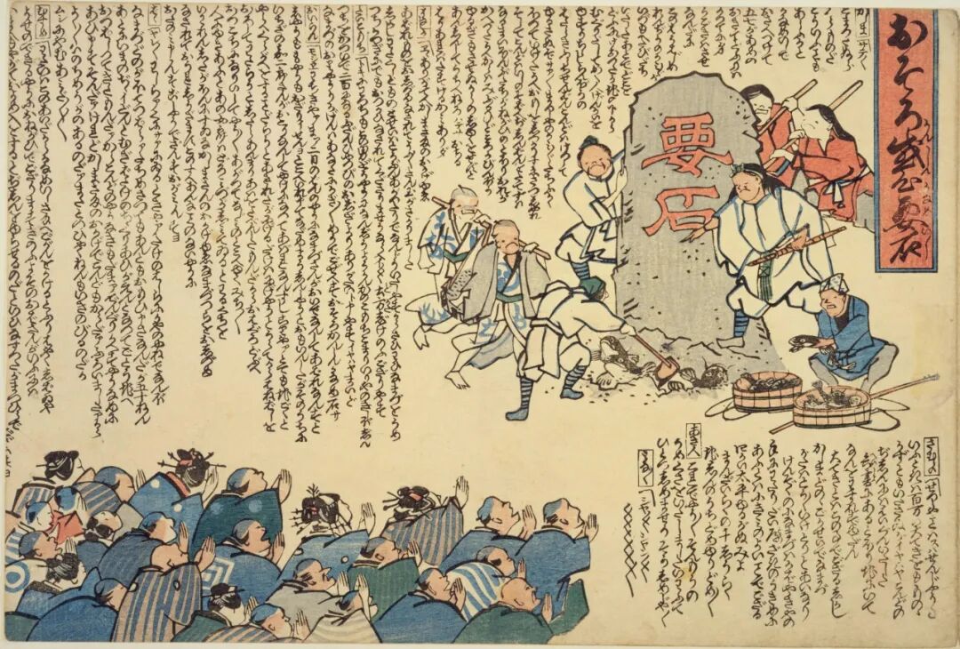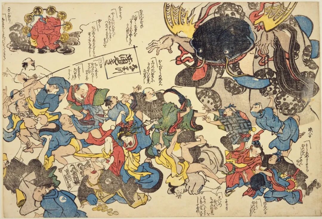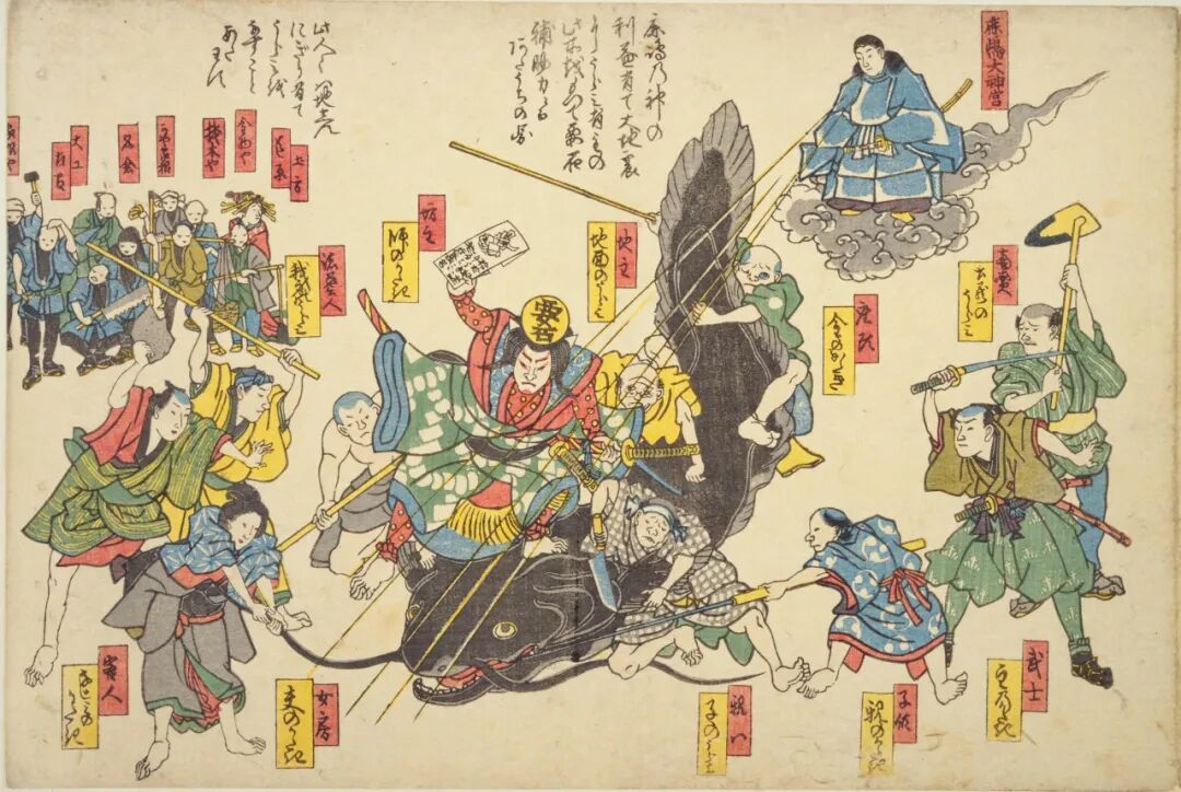 斯密茨写道,在鯰絵的这个子流派中,鲶鱼被想象成“世直し”(yo-naoshi,“社会改造”之意)之力,通过重新分配富人囤积的财富,恢复社会的平等。在旧世界的废墟下,也许有一个更加公平的新世界。以下鯰絵来自日本国立国会图书馆的收藏。由于这些版画大多是非法出版的,所以没有艺术家的签名,以逃避当时幕府的审查。