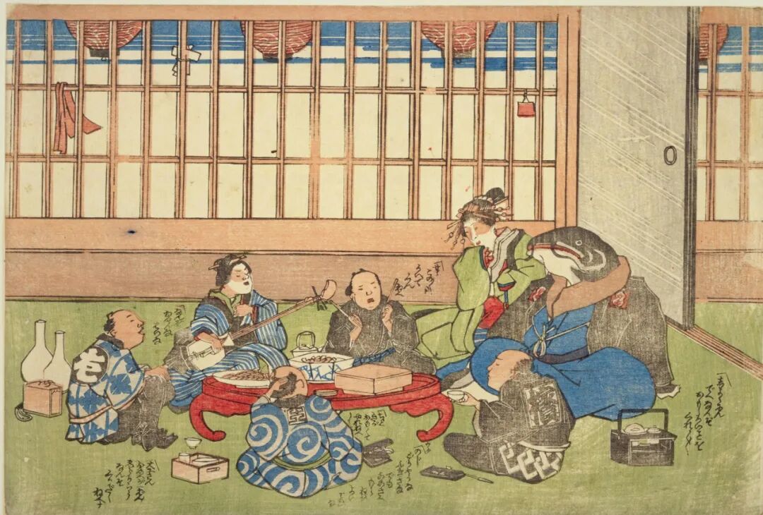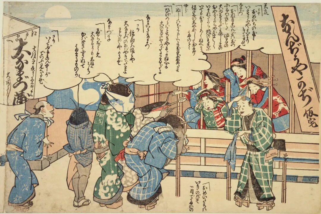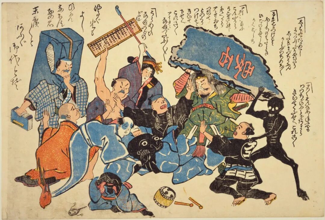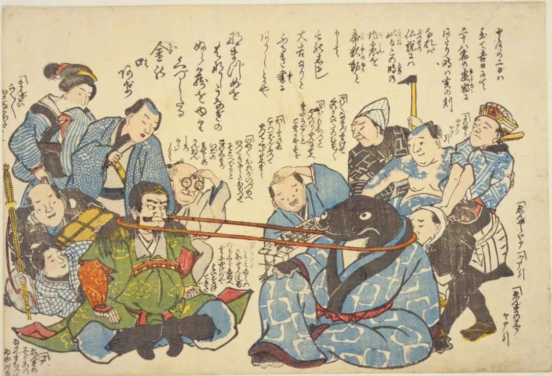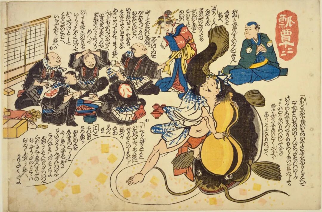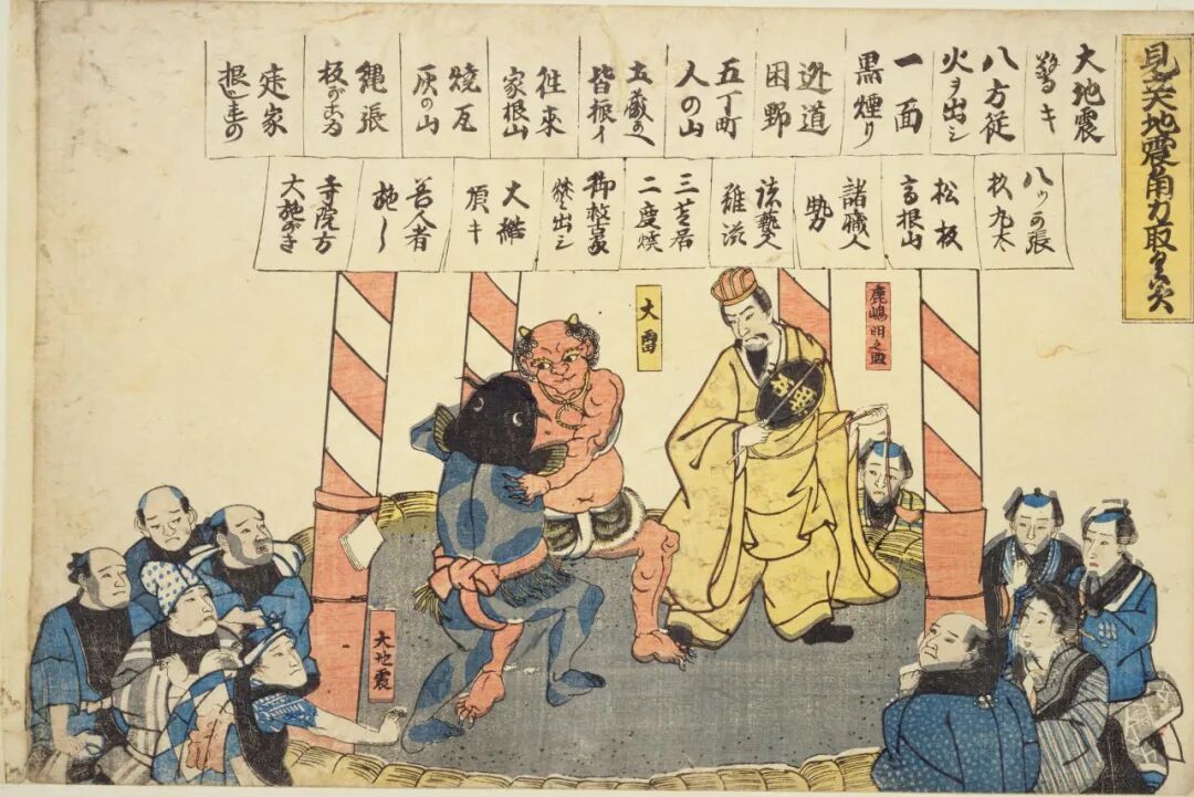 1855年的一幅鲶鱼版画,描绘了在震后经济复苏中获利的工匠。© wikimedia