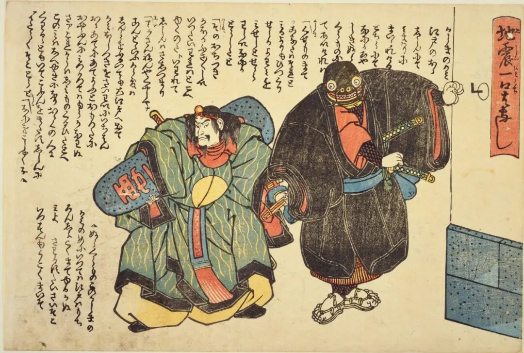 日本自古就有地震神(ないのかみ),据《日本书纪》卷廿二之记载,推古天皇7年(599年)夏四月,地动舍屋悉破,则令四方,俾祭地震神。在日本民间传说中,地震乃是大鲶在海底活动引起的,这种说法在江户时代中期就已存在。![]()