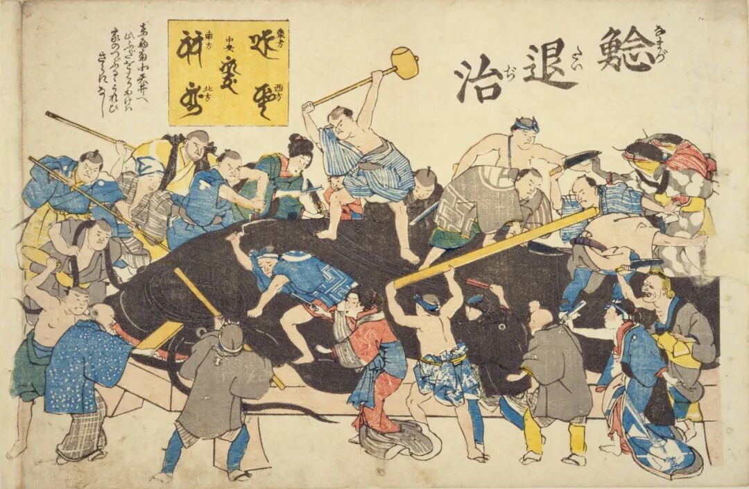 据说,1855年安政江户(东京的旧称)地震发生之后,伤亡人数众多,幸存者不得不用煤袋和酒桶搬运遇难者的尸体。由于江户的很多城区建在填海造地的沼泽地上,通常使用重型的建筑材料,日本首都成为了当时人们记忆中最严重的自然灾害区域。在此后的数周,余震持续不断地席卷这座城市,以至于那些幸运逃过房屋倒塌的人也选择在街头生活,而不愿在睡觉时冒着天花板可能坍塌下来的危险。尽管如此,新的艺术流派在废墟中悄然发展了起来:一种被称为“鯰絵”(namazu-e)的木刻版画。这种艺术来源于民间神话,即地震是由一头巨鲶(namazu)的活动引发的。这些版画通常描绘巨鲶被愤怒的人类袭击,或被诸神降服的场景。巨鲶和自然灾害之间的联系早在1855年地震之前就已存在[1],民间流传着神道教如何用石头压住鱼头来控制地震的故事(其他版本则显示这个生物被葫芦困住,形象上暗示了与完成看似不可能任务有关的成语表达)。然而,直到安政江户地震后,这个观念才在日本视觉文化中崭露头角。从11月11日江户地震发生之时到同年12月政府发布官方禁令,共发行了数百幅这样的版画作品[2]。整个江户的匿名版画家们,他们自己都还在震灾的阴影下挣扎,竟然在这短短的时间内创作出了一系列意义非凡的图像:巨鲶生出人类四肢;它们被缰绳牵引着,或被当作食物端上桌;巨鲶游览江户的红灯区,甚至装扮成剑客和相扑手。当时的购买者通常会在家中展示这些版画,作为护身符发挥其避邪的作用,保佑建筑及其居民[3]。这些版画最引人注目的,也许是灾难造成的破坏与象征性描绘灾难的图像情感基调之间的不协调。画中的鲶鱼,眼睛圆溜溜的,嘴角露出一口尖牙的笑容,似乎对它们带来的破坏毫不在乎,对那些奋力追杀它的人们也浑然不觉。作为一种艺术流派,“鯰絵”没有呈现人们可能期望的悲伤基调,而是采取了一种无政府主义式的幽默,将自然界不可预测的凶险变成一种近乎可爱、最终可驯服的恶作剧。尽管许多关于安政江户地震的历史强调了其对城市贫困居民的影响巨大,但学者格雷戈里·斯密茨(Gregory Smits)指出,实际数据并不那么明确[4]。地震后,城东散人(Jōtō Sanjin)写下了自己的亲眼所见,记述了江户城富人区的情况,该地区不仅被夷为平地,还被大火烧毁,因为许多贵族庄园中存放着进口的硝石。与此相反,尽管某些上层社会区域受到了严重损毁,但各行各业的普通人却有望从重建项目和中央政府为了防止潜在不满而慷慨提供的援助资金中受益(因为自然灾害通常被解读为宇宙对统治者不满的迹象)。这一现象成为鯰絵艺术家钟爱的主题之一,他们讽刺性地描绘了消防队员、建筑工人等为了一己私利而祈求地震的场景。这是另一种尝试,试图抓住深层分裂的时刻,并将其与熟悉的模式相调和:我们同胞的贪婪,而不是众神的冷漠,才是降临在我们所有人身上灾难的罪魁祸首。