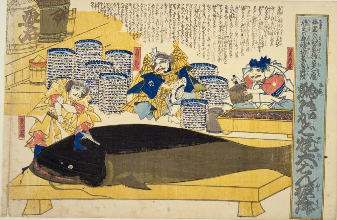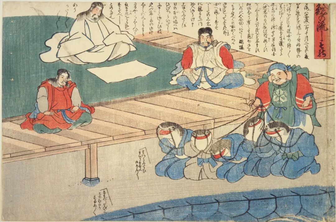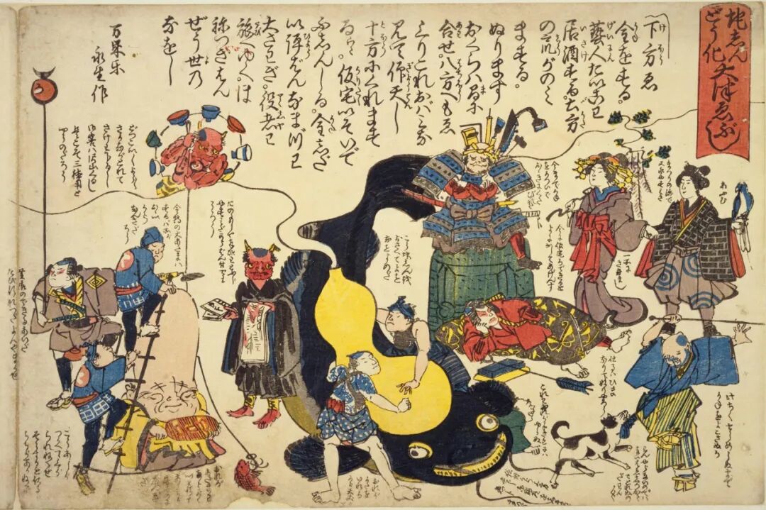 大黒天降服巨鲶。大黒天是日本神话和佛教中的神祇之一。通常被描绘为持有宝袋的黑色神祇,代表着财富、繁荣和商业繁盛。