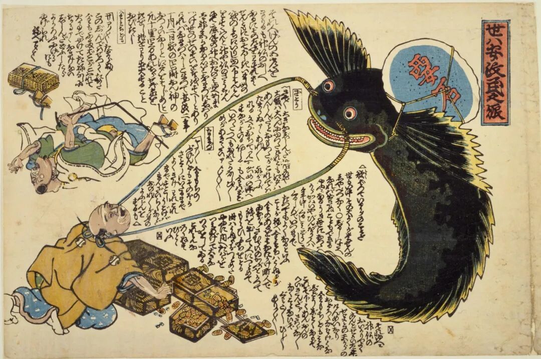 地震影响社会的公平性,至少部分地解释了灾难发生后几周内创作的许多版画的庆祝主题。在一幅作品中(上图),一头鲶鱼被开膛破肚,结果从它肚子里流出来居然是钱币,而非血液。在另一幅版画中,艺术家赋予鲶鱼类似鲸鱼的喷气孔,从中喷射出一股钱币,让岸边的观者欢欣鼓舞(下图)。