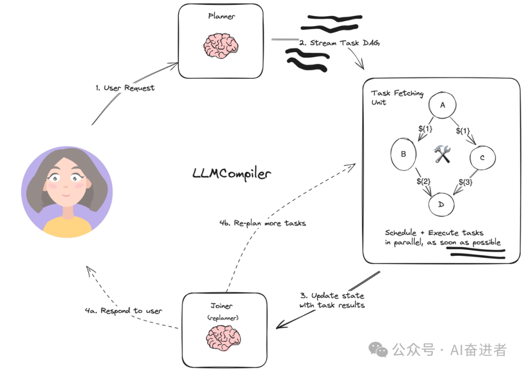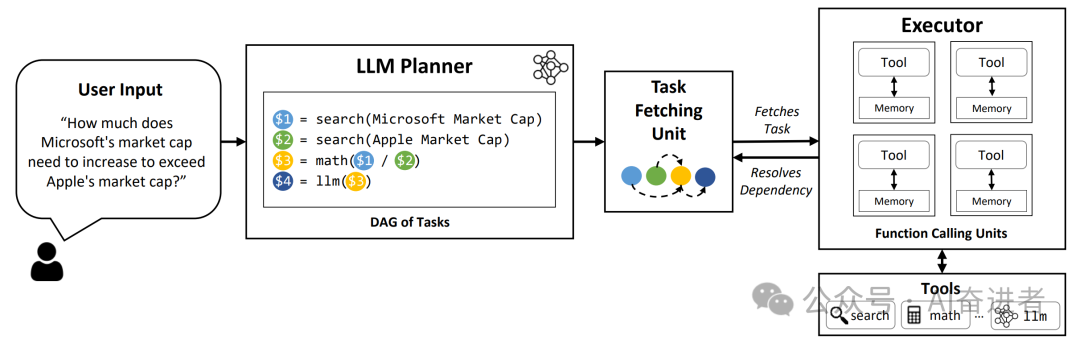 LLMCompiler的目标是优化大规模多模态推理问题的执行效率。传统的工具增强型LLMs通常需要手动指定任务之间的依赖关系,这可能会导致计算效率低下。而LLMCompiler则可以自动识别任务之间的依赖关系,并将其转化为执行顺序,从而实现更高效的计算。此外,LLMCompiler还支持动态重新规划,可以在未知中间结果的情况下适应执行流程,进一步提高了计算效率。
