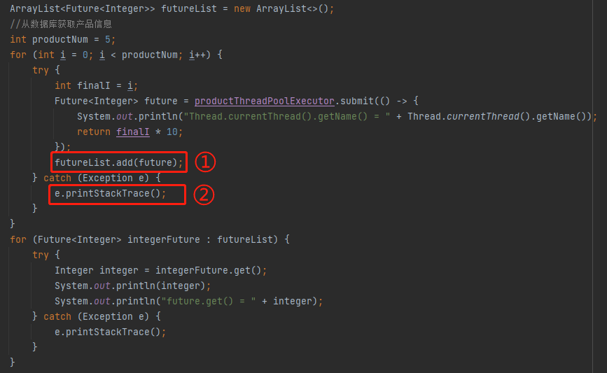 标号为 ① 的地方是线程池里面运行的任务,我这里只是一个示意,所以逻辑非常简单,就是把 i 扩大 10 倍。实际项目中运行的任务业务逻辑,会复杂一点,但是也是有一个 Future 返回。