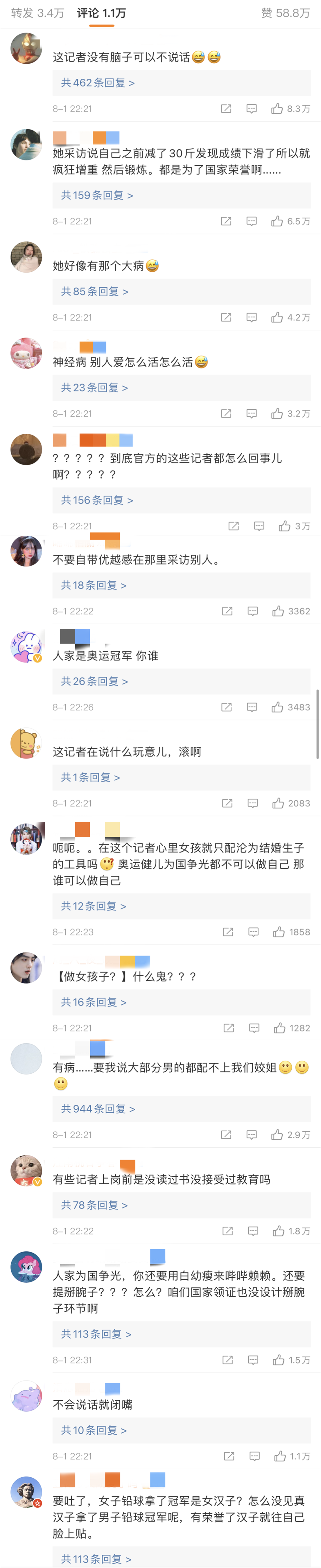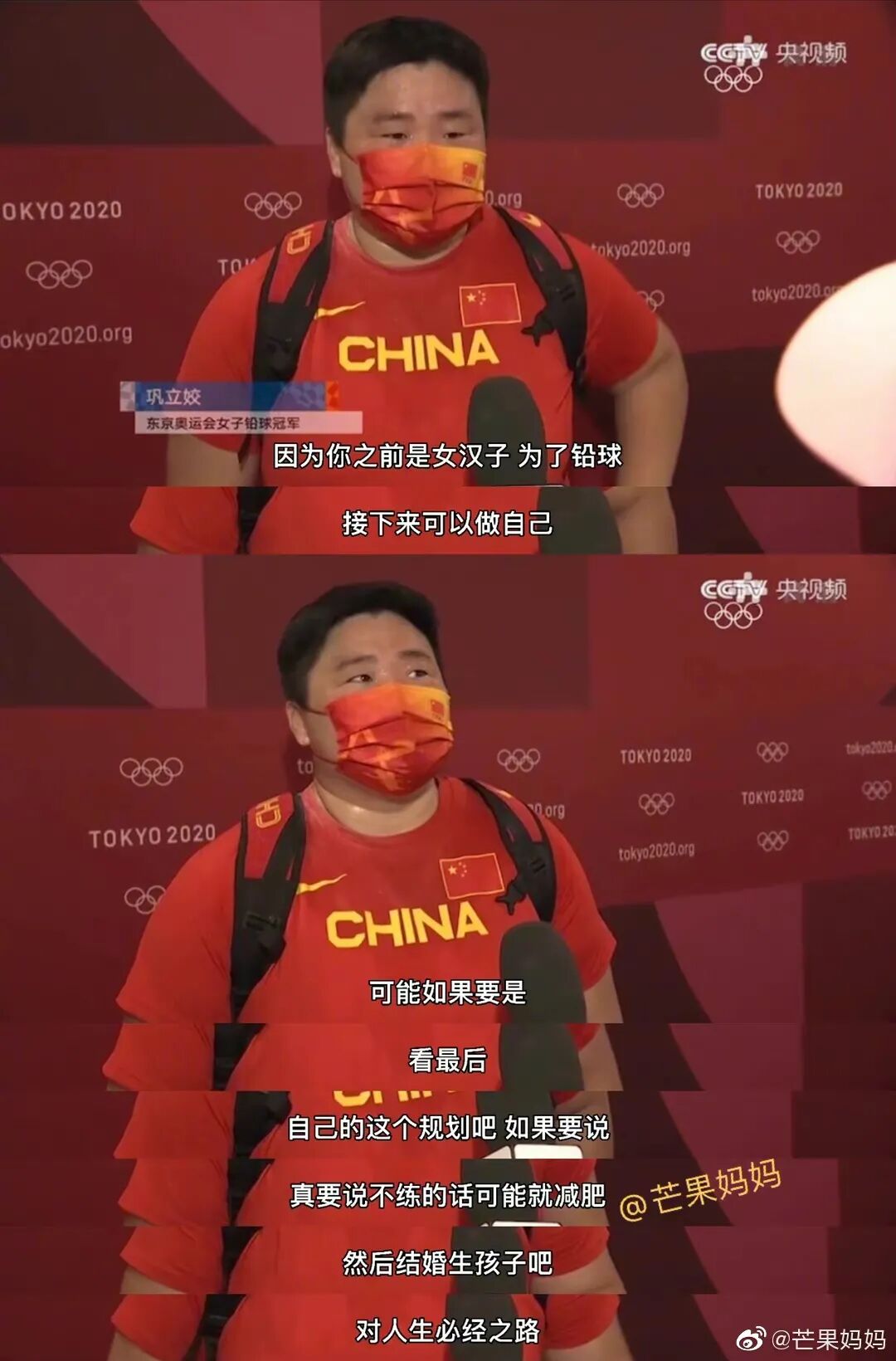 按说关心采访对象的个人生活也不是不可以,但这位陆大记者的询问方式活脱脱是无聊、碎嘴兼八婆。她反复强调巩立姣是一个女汉子,而巩立姣显然并不认同对自己的这个评价,笑着反驳,“我内心还是女孩子的。”其实这个时候作为一个专业人士,陆幽应该能够读懂巩立姣话语中所传递出来的轻微的抗议,然后调转话题,可是人家没有,人家迎难而上,继续问:请注意,她不是问巩立姣以后的人生计划,而是问巩立姣作为“女孩子”的人生计划,重点放在“女孩子”身上,好像巩立姣之前一直做的都是男孩子似的。巩立姣也被问得当场愣住,目光中充满疑惑,然后陆大记者又解释了一遍,“因为你以前是女汉子啊……”巩立姣明白了陆幽的意思,按着陆幽的思路做了回答,说如果以后自己真的不练习了,退役后会减肥生孩子,毕竟这是人生的必经之路。陆大记者已经够鸡婆的了,没想到摄像师比她嘴还碎,跟着问巩立姣既然准备结婚,有没有男朋友,巩立姣慌忙摆手不想说了,还是被追着问想找什么样的男生。巩立姣无奈只好给了个答案,“人看起来阳光,是个好人就行”。这时候陆大记者的经典语录又来了,“但是我觉得你跟他(男朋友)掰手腕子,他……”话还没说完,被巩立姣打断,表示自己不会掰手腕子,很温柔的。可以想象,她没说完的那后半句是什么,不外乎是“他都掰不过你”,陆大记者算是掉进“女汉子”的死循环不能自拔了。看完这段视频采访,由衷感叹巩立姣真是单纯善良的好姑娘,被如此挤兑还充满耐心的有问有答。“你的意思不就是说我胖,担心我嫁不出去吗?我胖吃你们家大米了,我嫁不嫁得出去关你屁事……”当然这是我个人的内心独白,我修养差,脾气不好,看见这种假装关心实际上暗含歧视的八婆做派就生气。巩立姣是壮,110公斤,那不是因为她好吃懒做,而是这个运动就需要强大的体力。她之前减过肥,但因此成绩下滑,为了给国家争光拿下金牌,才一直疯狂增肌练习。这是一种值得钦佩的牺牲。体重大就不是女孩子了吗,铅球运动员就不可以很温柔吗,往轻点说,陆幽存在刻板偏见,往大了说,就是容貌歧视、职业歧视。作为女铅球运动员的职业不符合女性特质,必须在退役后减肥了才好做女人;巩立姣是什么人啊,她不仅仅是奥运冠军,她拿到的这块金牌是中国奥运历史上的第一枚女子铅球金牌,对于中国的投掷项目来说,这是一次里程碑式的突破。她以甩掉第二名一大截子的成绩向全世界展现了什么叫“中国力量”,在她身上凝聚了一个人孜孜不倦追求梦想的精神实质。巩立姣出生于1989年,今年已经是32岁的老将,黄金运动生涯所剩无几,里约奥运会遭遇滑铁卢,憋着一口气等待东京奥运会雪耻。苦练4年后,等来的却是奥运会因为一些原因延期一年的消息,噩耗传来,“感觉天塌下来”。本来很好的状态,因为这突如其来的打击崩坏了,精神消沉,伤病作祟,难以投出突破20米的成绩。在最难的日子里,全靠着心理专家的辅导和自我疏导熬过来了,事后这段时光,她笑着笑着就哭了,“实在是太煎熬了,5年对运动员来说,尤其是我这么大年龄……这一刻真的等得太久了。”4次冲击奥运会金牌,前三次都失败了,这次终于圆梦,赛程看起来轻松,实际上背负无数压力,赛前一晚她只睡了四五个小时。7届世锦赛和4届奥运会,巩立姣终于能够堂堂正正站上奥运会的最高领奖台,这块金牌的背后是21年的汗水和痛苦,但她相信,“所有的坚持都是值得的。”实现了梦想之后,她还有新的追求,“现在伤病基本没有,祖国需要我,我肯定继续坚持。”她的对手亚当斯已经是36岁,身为人母,还是没有放弃,以自己“妈妈运动员”的身份夺得了一枚铜牌,成为巩立姣的榜样。她也想要自己的孩子,同时也不想放弃自己的运动员生涯,还想要参加下一届奥运会,“万一蝉联了呢。”对着这样一个人,不是关注她运动生涯的收获,不想着多从她那里问出一些宝贵的人生感悟,偏偏一个劲集中在她的八卦话题上,像三姑六婆一样催婚,真是浪费彼此的时间。这无论是对一个优秀运动员,还是一位女性来说,都是一种极大的冒犯。陆幽的采访实在有失水准,根本在于她传递出一种陈腐的价值观,不管你是干什么的,不管你为国家做了多大的贡献,只要你是一个女人,嫁人终将是你最终的人生使命。采访男运动员时,她一定不会这样反复纠缠着问,“你准备找个什么样的女朋友,你准备什么时候结婚”?她关心的是他的事业,未来的规划,还打算拿几块金牌。他们不需要婚姻证实自己的价值,而女人却需要。巩立姣在获奖后代表自己和所有练铅球的女孩子们向大家喊话:“请大家多关注我们这些胖胖的女孩子吧,她们都很善良的。”这句话说得令人心疼,说明她们日常始终都遭遇各种各样的歧视,陆幽的观念代表着社会上一部分人的偏见,令她们遭受打击。关于陆幽本人的那些八卦往事,算了我都不想多说,有兴趣的可自己搜一下,可是精彩得紧。从陆幽的人生轨迹来看,她是那种典型的按照男权社会的评价体系来生活的女人,如果一个女人不够年轻漂亮,不能拥有男人眼中的魅力,就没有价值了。她自己深陷在这种体系中无法自拔,她用同样的眼光来衡量同性,面对按照她所谓的标准,不够年轻漂亮,缺乏“女人味”的同性,充满优越感和鄙视。但看到陆幽的采访遭到网友普遍的质疑和批评,还是非常欣慰的,说明现在无论男女