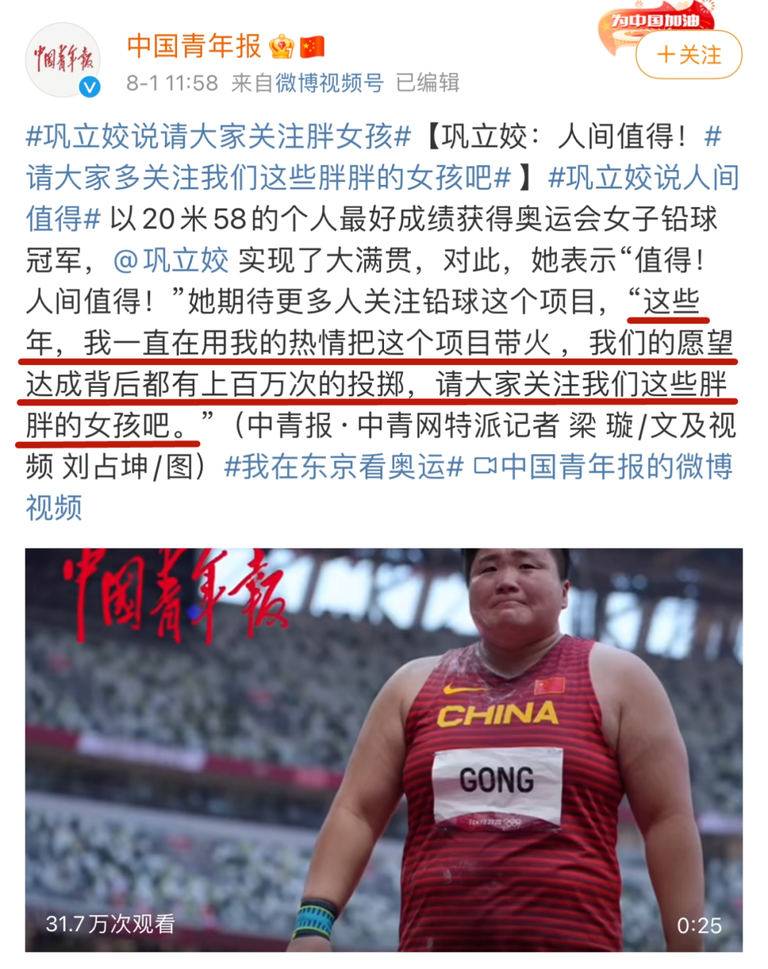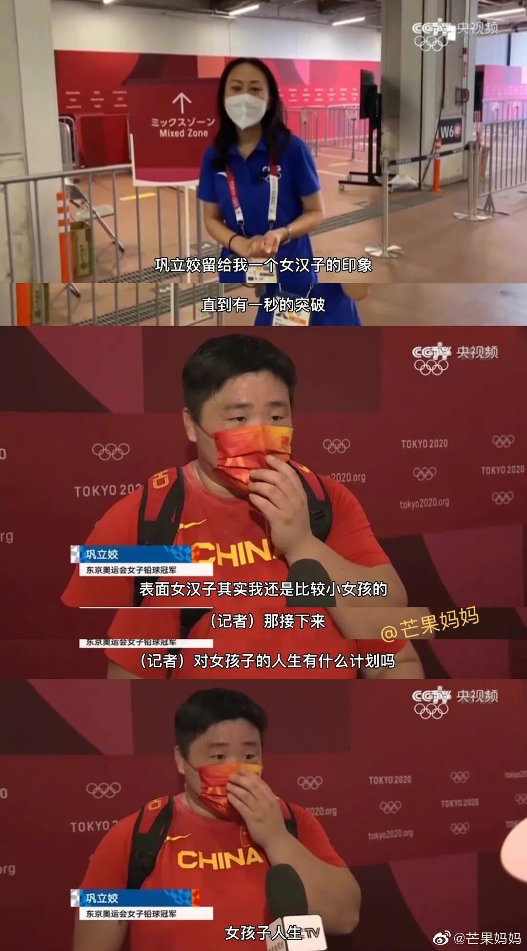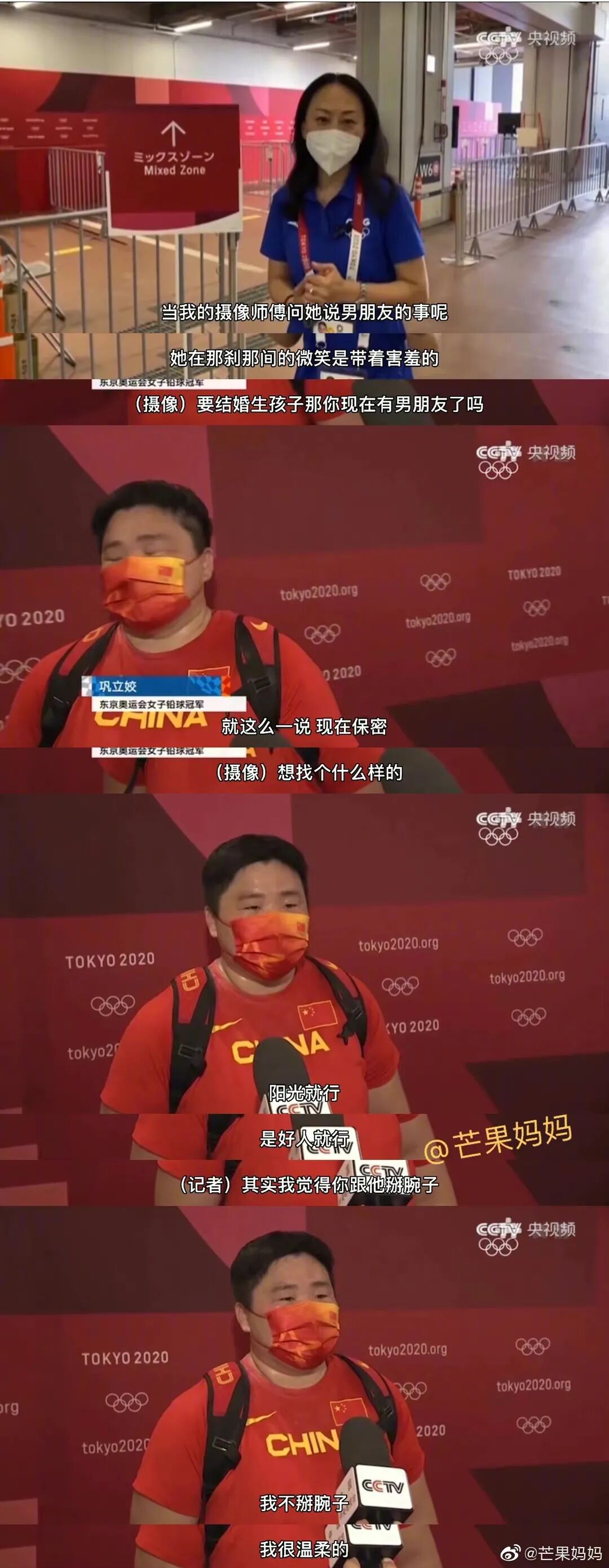 这两天的热门话题是中国选手巩立姣,她夺得东京奥运会女子铅球冠军,同时也是中国军团在田径大项的第一金,那张可爱的笑脸瞬间登上各大网站的头条。比赛结束后她接受了央视记者陆幽的采访,在短短三分钟的篇幅里,只有前面两分钟是关于巩立姣的赛场生涯回顾,最后一分钟则完全围绕着她的感情生活进行。