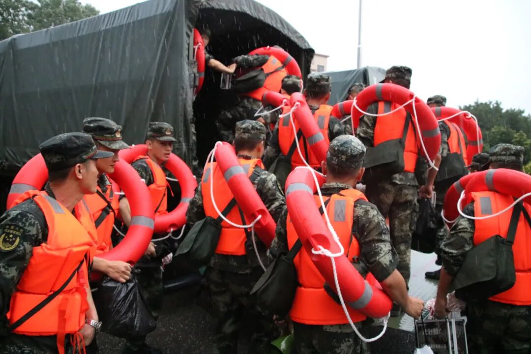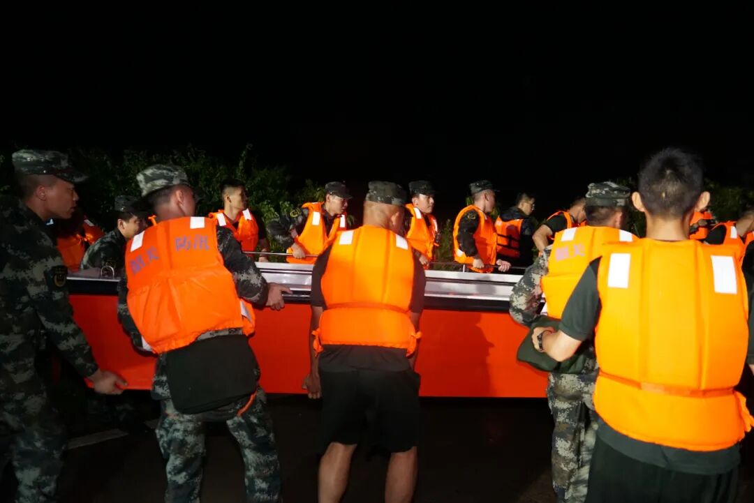 救援官兵连夜紧急转移受灾群众、抢运物资。