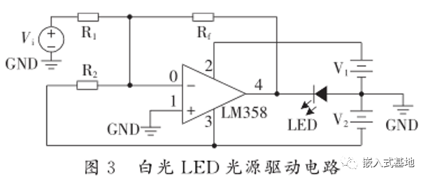 LED 驱动电路除了提供足够宽范围的开关电流以保证白光 LED 的正常工作外,还须提供合适的静态工作点,使光源能输出足够的功率并具有良好的线性度,确保信号经调制后能线性输出。设计的白光LED光源驱动电路经过处理器编码产生的传输信息作为驱动电路的输入,将输入信号进行放大的同时给予一定的偏置,确保LED 光源正常工作,该电路可根据所用光源的特性通过调节可变电阻值实现对输出量的改变,依据实际应用中的光源参数进行灵活调节。