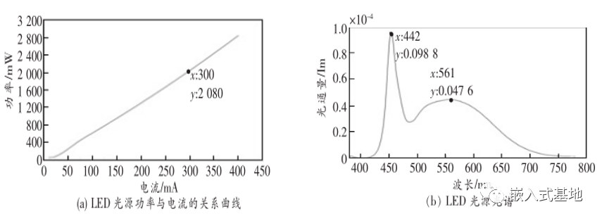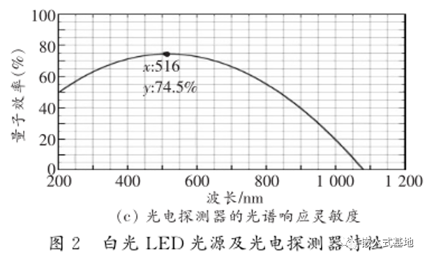 实验选用 3W 的大功率白光 LED 作为信号源,为在尽可能不影响光源正常工作的前提下实现稳定可靠的无线通信,实验选用略低于额定工作电流的 500mA 作为直流偏置点。图 2 所示为白光 LED 光源及光电探测器特性。由图 2 ( a )可知,在最大工作电流范围内,LED 光源功率与电流呈线性关系,光源具有良好的调制特性。图 2 ( b )为使用积分球测得的白光 LED发光光谱,可见白光 LED 光源发出的光谱主要包括峰值在 442nm 处由 LED 自身发出的蓝光和峰值在 561nm 处由荧光粉受激发产生的黄光。而实验选用的光电探测器的光谱最大响应灵敏度在516nm 处,如图 2 ( c )所示,位于蓝光和黄光的峰值波长之间,且光谱响应范围涵盖整个可见光波段。