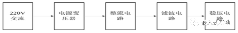 此次设计的稳压电源由电源变压器、整流电路、滤波电路和稳压电路四个部分组成,如图