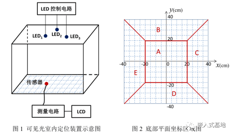 设计并制作可见光室内定位装置,其构成示意图如图 1 所示。参赛者自行搭建不小于 80cm×80cm×80cm 的立方空间(包含顶部、底部和 3 个侧面)。顶部平面放置 3 个白光 LED,其位置和角度自行设置,由 LED 控制 电路进行控制和驱动;底部平面绘制纵横坐标线(间隔 5cm),并分为 A、B、C、D、E 五个区域,如图 2 所示。要求在 3 个 LED 正常照明(无明显闪烁)的情况下, 测量电路根据传感器检测的信号判定传感器的位置。