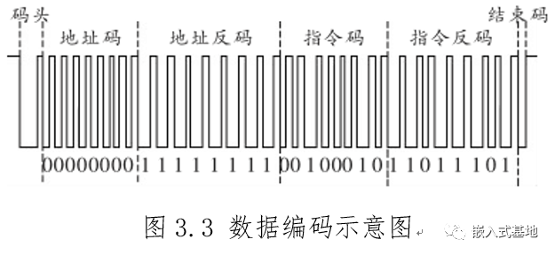 数据传输的格式包括:起始码头、地址码、地址反码、指令码、指令反码和结束码。码头由一个连续的235φs的高低电平组成,结束码由一个150φs低电平组成。地址码、地址反码、指令码和指令反码均为8位数据格式,按照低位在前高位在后的顺序发送,增加地址反码和指令反码是为了提高信息传输过程中的准确性和可靠性。光源在循环发送位置信息的过程中,在空闲时隙系统向 LED 光源发送的均为高电平,以保证 LED 光源能正常提供照明服务。我们将一个逻辑1的传输设定为112φs(28φs高电平和84φs低电平),一个逻辑 0 的传输设定为56φs(28φs高电平和28φs低电平),具体数据编码格式如图3.3所示。图3.3反映位置信息的数据格式“ 0-256-34-221 ”,其中“ 0 ”字段即LED光源对应区域的地址坐标,“ 34 ”字段表示对当前坐标在室内环境中的一种具体提示指令。根据标签定位技术的特点,为避免在定位区域中出现待测目标同时接收多个信号源发来的位置信息而出现的混乱现象,系统在发射端会对多个 LED 光源进行分时发送信号。当传输信号的频率大于 60Hz 时,白光 LED 灯不会出现明显的闪烁现象,人眼也无法分辨 [11-12 ] ,但如果出现连续的逻辑 1 或连续的逻辑 0 时,将会导致 LED 光源发光亮度发生变化,影响照明效果。因此在系统中采用上述编码方式可保证序列中每一比特由两个变化脉冲组成,可以有效减少 LED 光源在发送定位信息时对照明产生的影响。