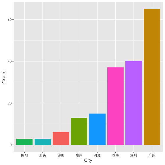 接着先根据省份、城市进行数据的分组和聚合,选择排名前二十的,利用ggplot2包画出如下的城市分布图(代码太长,不放了,就是这么任性,有需要参考的直接向我拿):