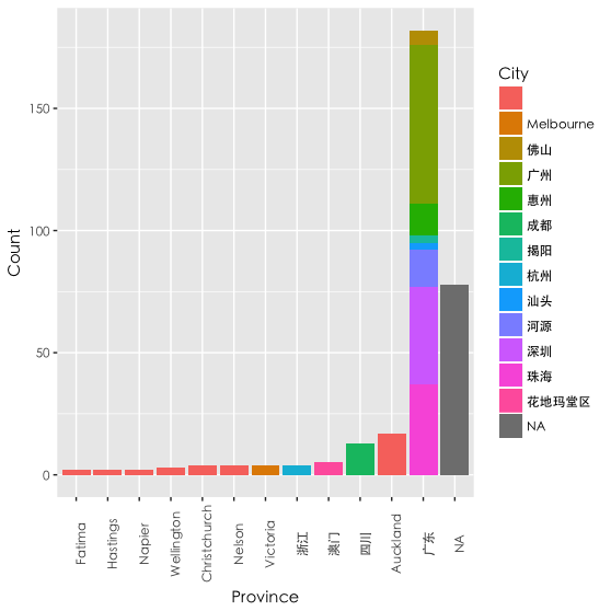 看来我大部分的朋友都是在广东的(不是废话吗),其中广东的朋友大部分集中在广、深、珠,第二名是在奥克兰, 接着是四川、澳门等。灰色的NA值是指没有设置自己所在地的朋友,一共有70多人。另外,在国外的朋友由于微信的设置问题(很多是直接跳过省份,只有城市可以选择的),很多国外的城市被误当成了省份。