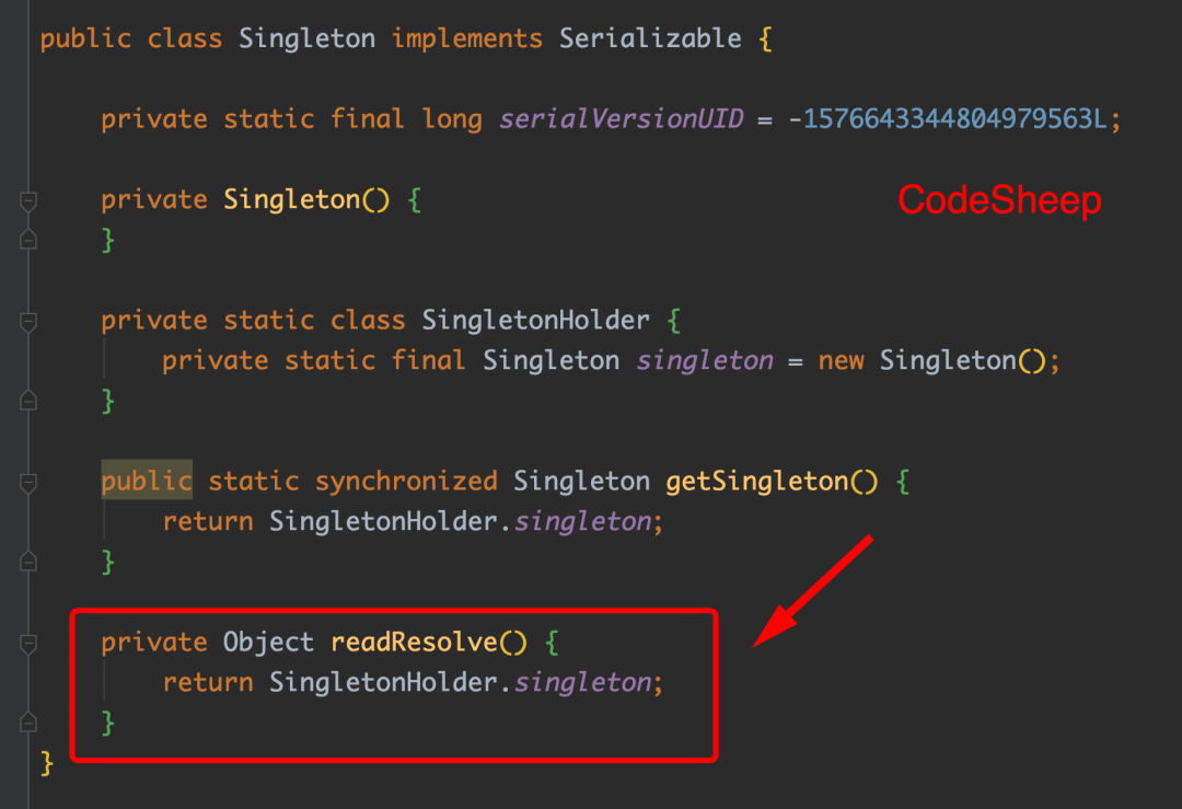这样一来,当反序列化从流中读取对象时,readResolve()会被调用,用其中返回的对象替代反序列化新建的对象。