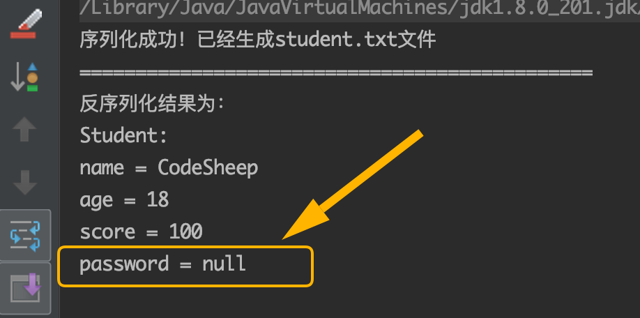 这样在序列化Student类对象时,password字段会设置为默认值null,这一点可以从反序列化所得到的结果来看出: